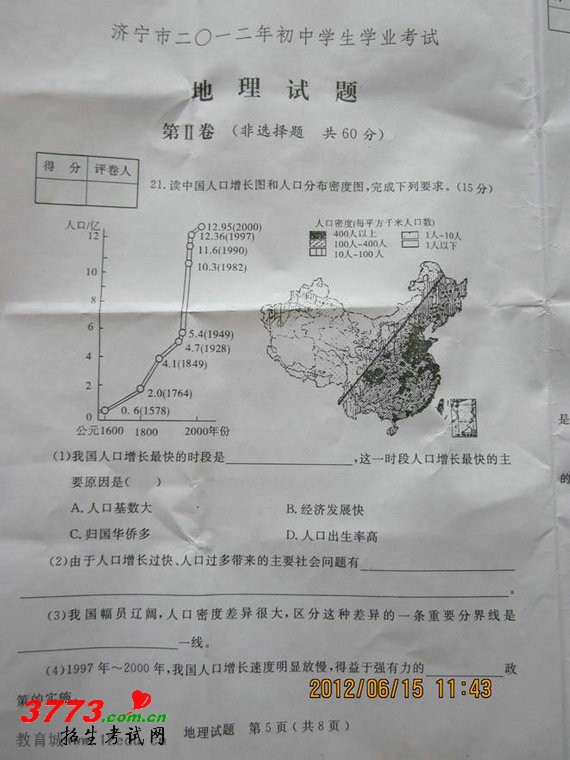 [组图]2012年济宁中考地理试卷答案及评分标准