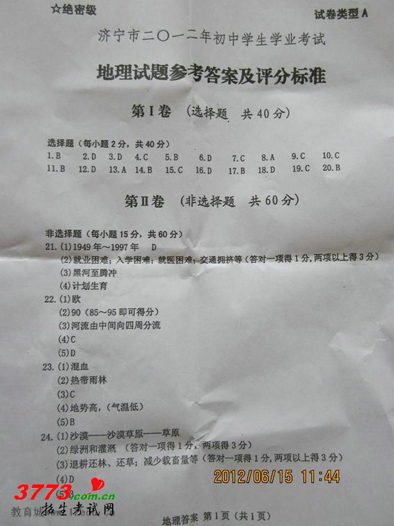 [组图]2012年济宁中考地理试卷答案及评分标准