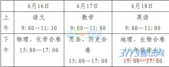 考试统一安排在2016年6月16日至6月18日进行。其中,毕业年级考试时间为6月16日、6月17日和6月18日上午;八年级生物、地理考试时间为6月18日下午。