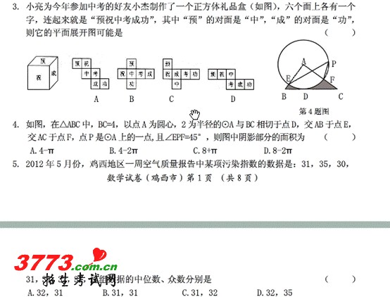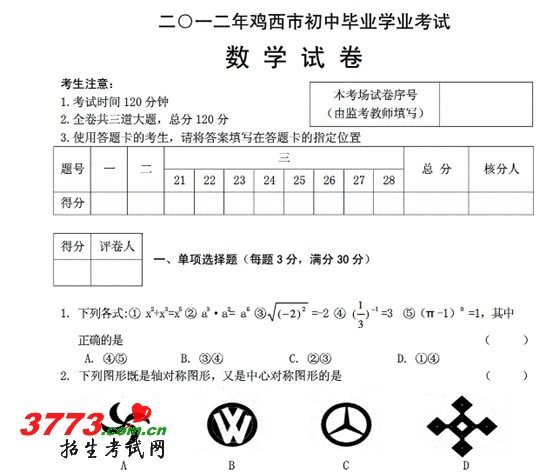 [组图]鸡西市2012年中考数学试卷试题及答案
