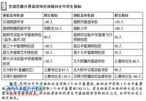 五华、盘龙、官渡、西山和呈贡户口的初中毕业生均可报考五区内普通高中,实行统一录取。郊县区考生报考县属普通高中学校,按各县区招考机构的要求填报志愿录取。国家级、省级开发(度假)园区的初中毕业生按考区内考生报考范围填报志愿招生;阳宗镇初中毕业生按主城区考生报考范围填报志愿录取。