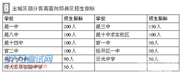 按现行昆明市主城区一级高(完)中郊县班招生政策,面向滇中产业新区的原安宁市、嵩明县户籍的考生招生;原官渡区大板桥镇户籍的考生,按主城区考生录取范围填报志愿招生。
