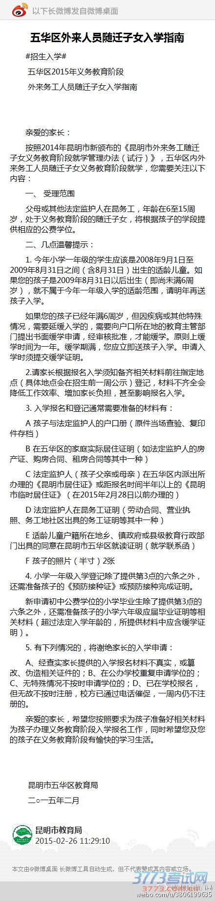 五华区外来人员随迁子女入学指南:#招生入学# 五华区2015年义务教育阶段 外来务工人员随迁子女入学指南 亲爱的家长: 按照2014年昆明市新颁布的《昆明市外来务工随迁子女义务教育阶