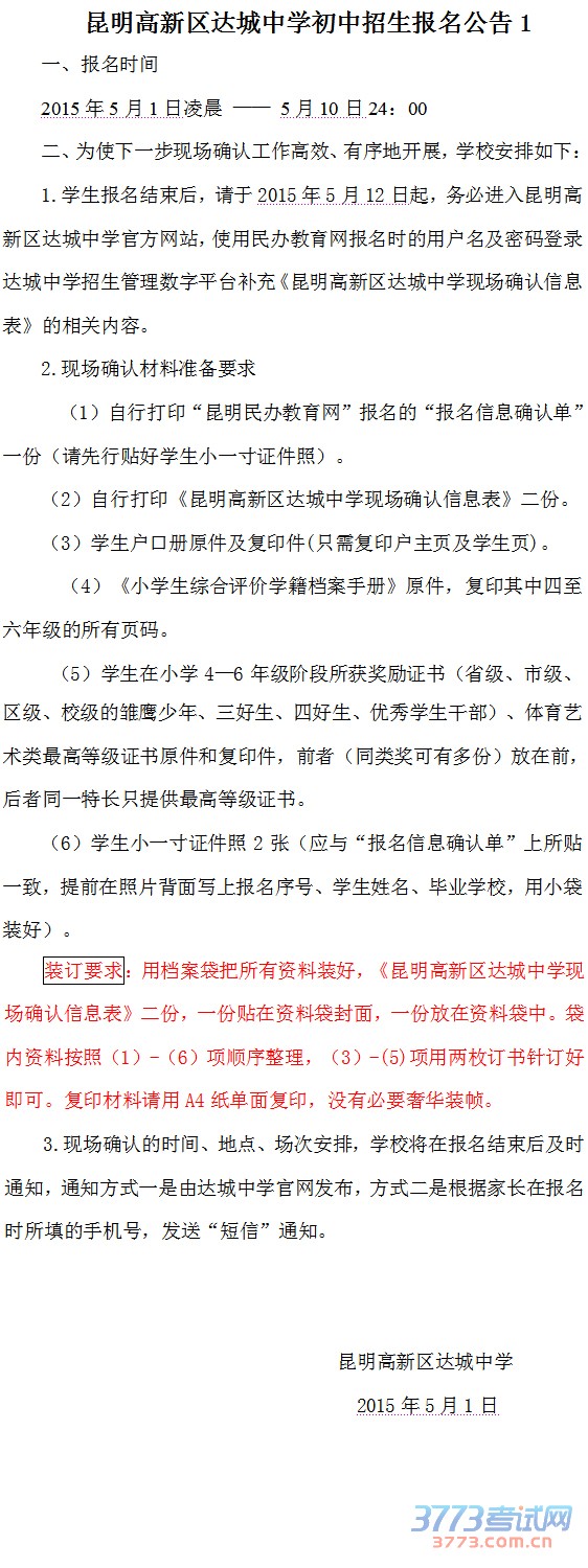 [图文]2015昆明高新区达城中学初中招生报名公告