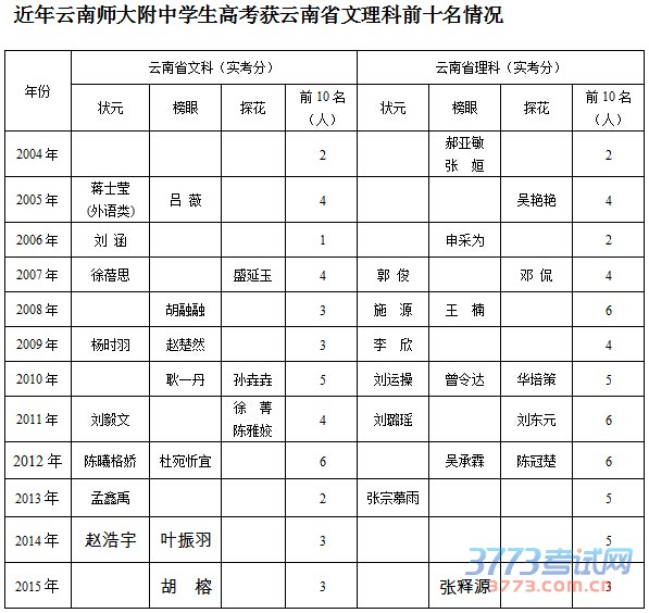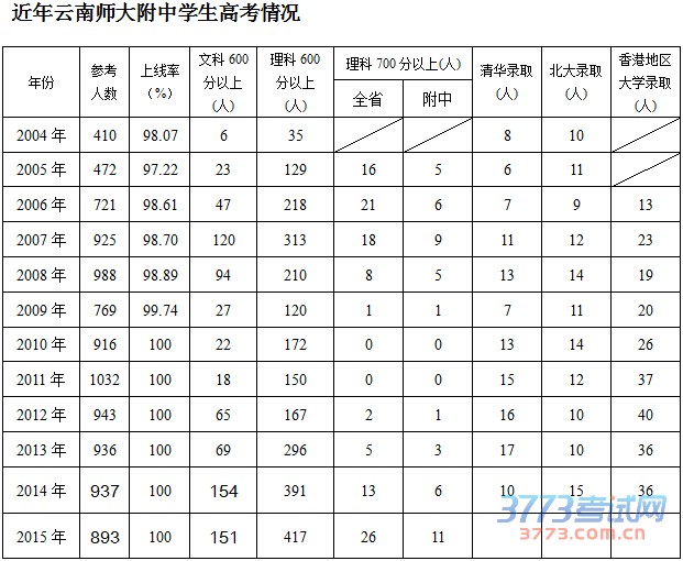 我校的教学质量、高考情况一直倍受给予我校厚爱的广大学生和家长的关注。2003年7月迁入高新区后,我校如雨后春笋焕发了青春,不仅办学条件得到了极大的改善,同时办学理念得到了升华,办学特色更加鲜明,一支品德高尚、业务精湛、治学有方、为人师表的教师队伍炉火纯青。2009年云南省进入高中课改后,我校各项工作始终在正确的轨道上有序地展开,很多前瞻性工作,为教学赢得了先机,课改后最近四年来的高考,我校600分以上人数、文理科全省前十名人数、前五十名人数、一本上线率、被清华北大等“985”高校录取人数、被香港大学等香港高校录取人数等,均继续高居全省之首,特别是2015年,全校文理科893名(文科258名,理科635名)应届高中毕业生参加高考,高考成绩总分600分以上568人,占我校参考人数的63.61%,占全省600分以上人数的12.37%,其中文科总分600分以上151人,占我校参考人数的58.53%,占全省文科600分以上人数的11.9%;理科总分600分以上417人,占我校参考人数的65.67%,占全省理科600分以上人数的12.54%;文科一本上线率91.09%,理科一本上线率96.54%,文理科一本上线率94.96%;文科本科上线率99.23%,理科本科上线率99.85%;文理科上线率100%。文科总分校平均分602.91分,超过一本控制线62.91分,理科总分校平均分611.18分,超过一本控制线111.18分。不含加分理科全省700分以上26人,我校11人,占全省42.3%;不含加分文科有3名同学总分进入云南省总分前十名、9名同学总分进入云南省总分前二十名;不含加分理科有3名同学总分进入云南省总分前十名,八名同学总分进入云南省总分前二十名。含加分文科有18名同学进入云南省总分前48名,占全省37.5%,含加分理科有23名同学进入云南省总分前50名,占全省46%。张释源等8名同学取得单科云南省第一名。充分表明我校对新课改的理解是正确的、应对是有效的。