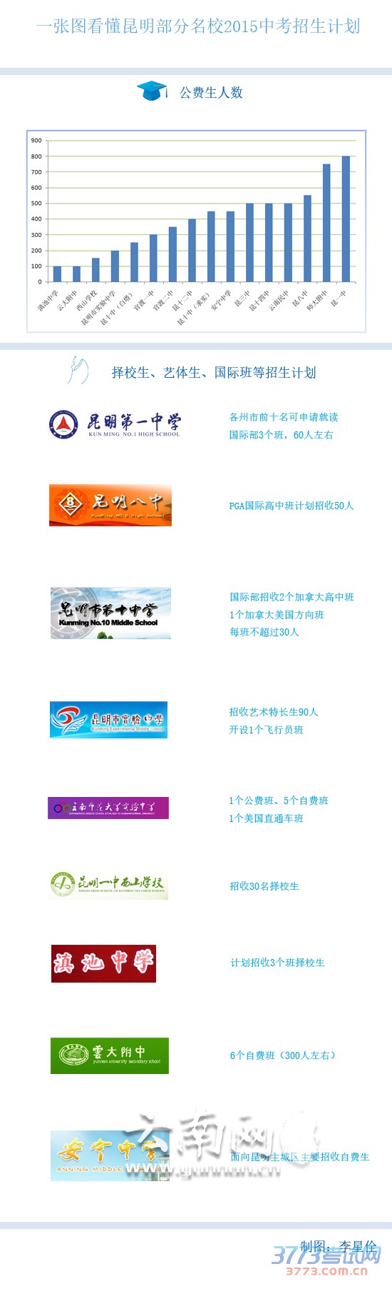 昆三中今年计划招收公费生500名,其中面向昆明主城区招收330名,郊县区招收170名,混合编班,文理科均设实验班。此外,昆明滇池中学(昆三中分校)计划招收100名公费生,3个班的择校生,理科设实验班。