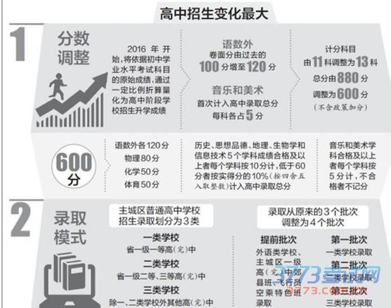 2016年起,我省中考总分将由880分调整为600分,并首次将音乐和美术两科成绩计入总分,昆明市普通高中招生录取模式也将进行调整。昨日,昆明市教育局发布《昆明市考试招生制度改革方案》(以下简称《方案》),整体设计小学教育到中等职业教育考试招生制度改革政策,结合实际制定、完善现行考试招生办法,方便家长和考生。