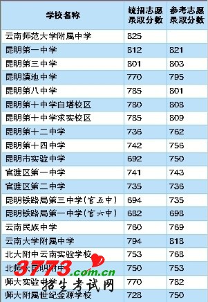 云师大附中825分,昆一中812分,昆三中801分。
