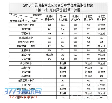 根据昆明市招考院公布的信息,最高录取分数线为云师大附中819分,昆一中、昆三中的录取线也均在800分以上,参考志愿录取分数在790分以上的学校则包括昆一中、昆三中、昆八中、昆十中白塔校区、昆十中求实校区、云大附中等。