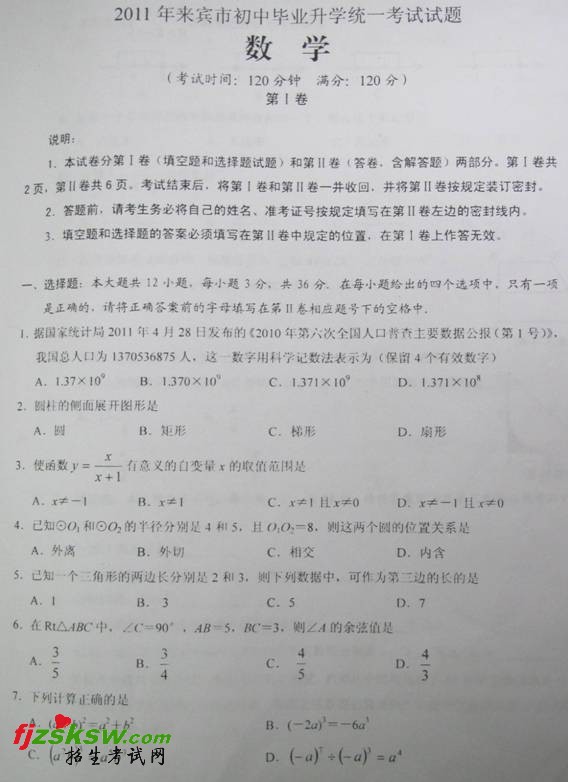 [组图]来宾2011中考数学试题试卷及参考答案