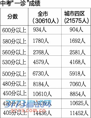 截至4月28日,4月21-23日举行的兰州市九年级诊断考试(“一诊”)共收到全市148所学校报送的成绩,学生总数30610人。其中,城市四区(城关区、七里河区、安宁区、西固区)有90所学校,学生21575人;城关区有40所学校,学生11338人;七里河区有19所学校,学生4342人;安宁区有9所学校,学生2498人;西固区有22所学校,学生3397人;红古区有7所学校,学生1550人;榆中县有15所学校,学生2260人;永登县有24所学校,学生3112人;皋兰县有6所学校,学生878人;新区有6所学校,学生1235人。