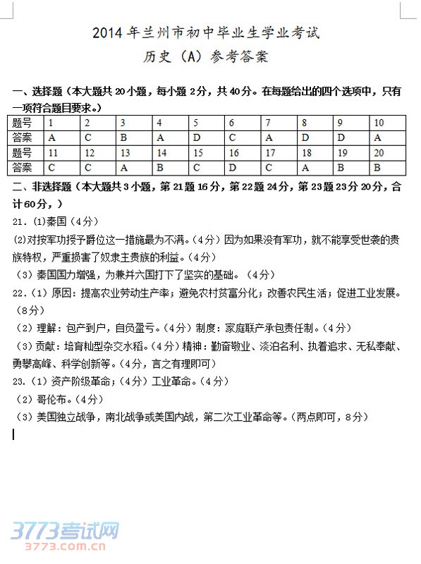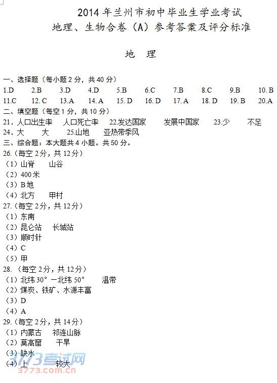 [组图]2014兰州中考历史地理生物思想品德答案发布