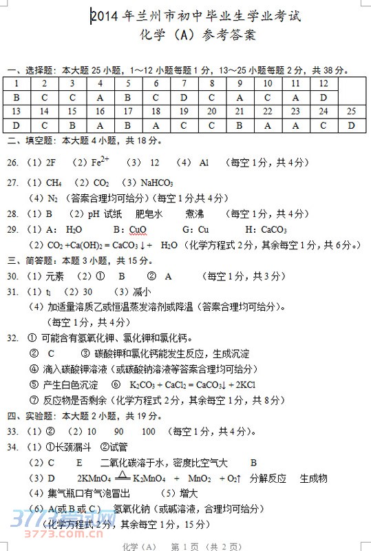 [组图]2014兰州中考化学答案发布