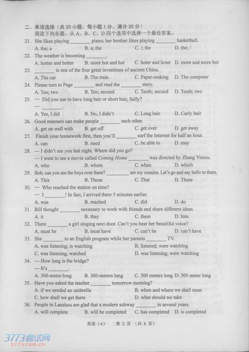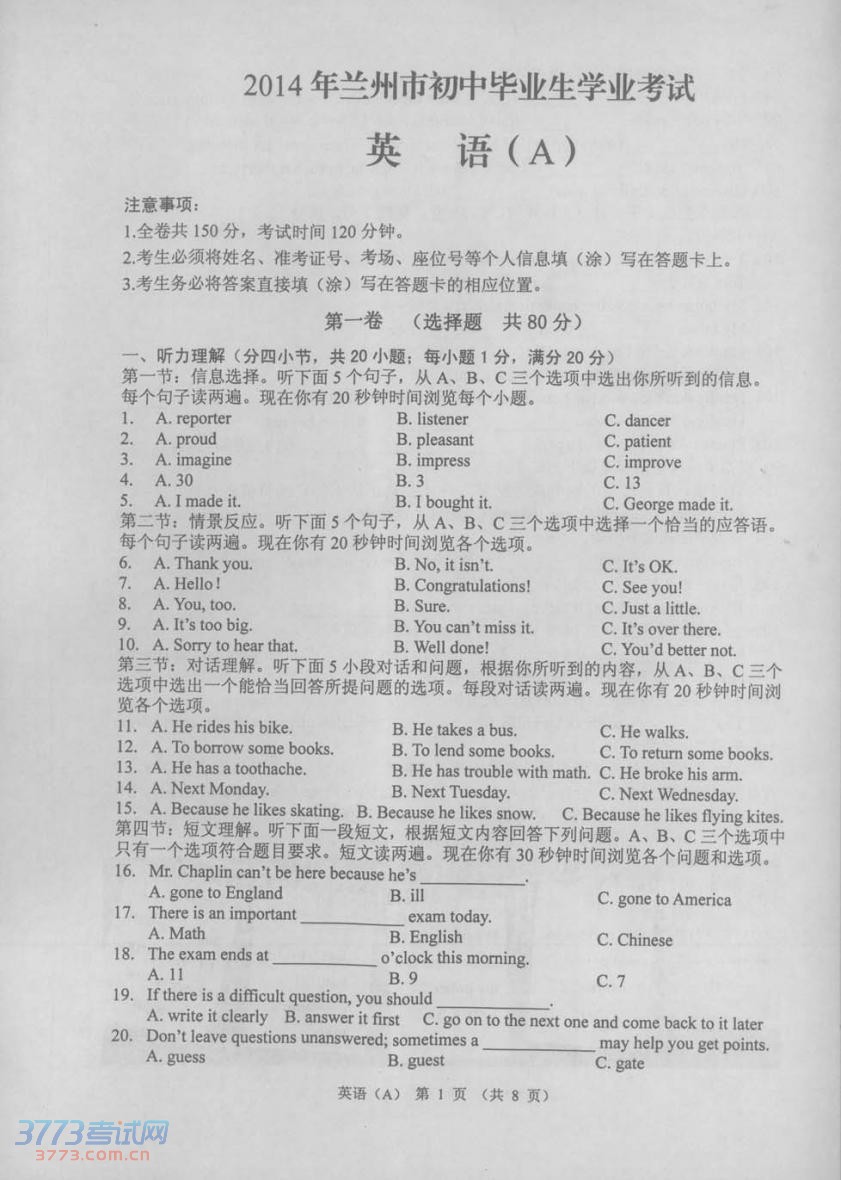 [组图]2014兰州中考英语试题发布