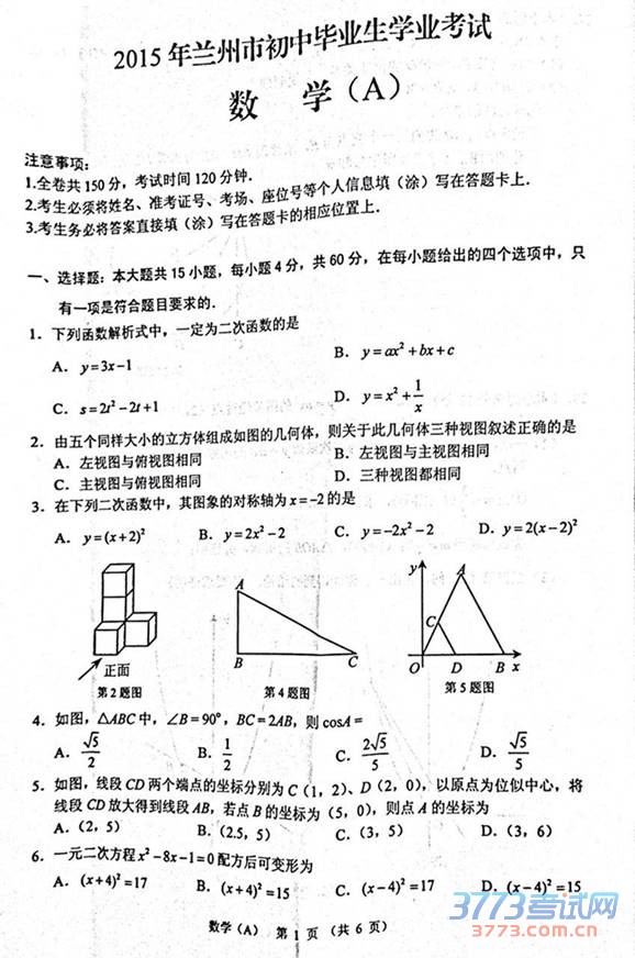 [组图]2015甘肃兰州中考数学试题及答案发布