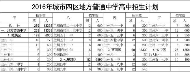 2016年,兰州市城市四区初中毕业生预计22123人,高中阶段学校计划招生22050人,初中毕业生升学率为99.67%。城市四区地方普通高中下达招生计划269班(含特长班),13338人,占城市四区高中阶段计划招生人数的60.49%。特长班招生以兰州生源为主,在全省范围内提前招生,具体如下: