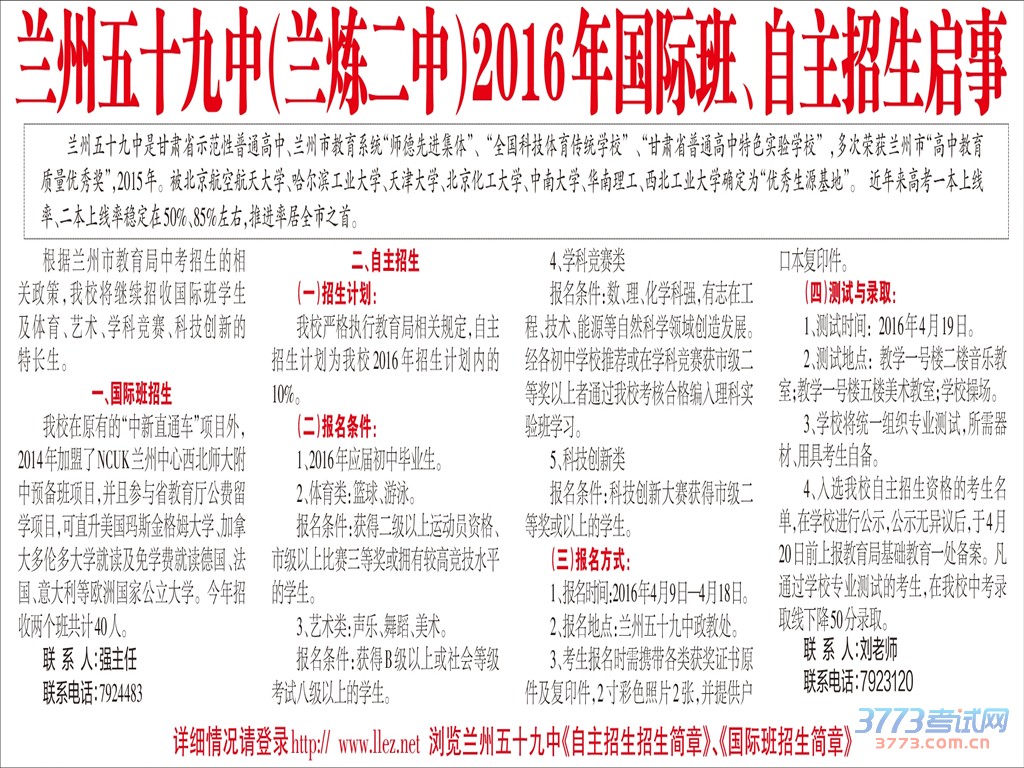 [图文]兰州五十九中兰炼二中2016年自主招生简章