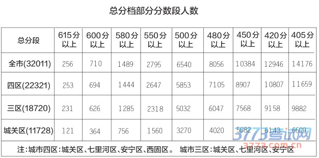 兰州市九年级学生参加的今年中考前的第一次诊断考试已于4月15日结束。截止4月18日,共收到160所学校报送的诊断考试成绩,学生总数32011人。其中,城市四区97所学校,学生22321人;城市三区76所学校,学生18720人;城关区45所学校,学生11728人;七里河区19所学校,学生4321人;安宁区12所学校,学生2671人;西固区21所学校,学生3601人;红古区7所学校,学生1471人;榆中县21所学校,学生3523人;永登县23所学校,学生2652人;皋兰县8所学校,学生1205人;新区4所学校,学生839人。此次诊断考试,语文(150分)、数学(150分)、英语(150分)、物理(120分)、化学(100分)五科总分值为670分。分析结果显示,诊断考试五科总分最高分为639分,平均分为375.73分。