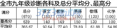 此次诊断考试,语文(150分)、数学(150分)、英语(150分)、物理(120分)、化学(100分)五科总分值为670分。分析结果显示,诊断考试五科总分最高分为639分,平均分为365.67分。