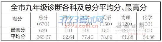 此次诊断考试,语文(150分)、数学(150分)、英语(150分)、物理(120分)、化学(100分)五科总分值为670分。分析结果显示,诊断考试五科总分最高分为639分,平均分为365.67分。