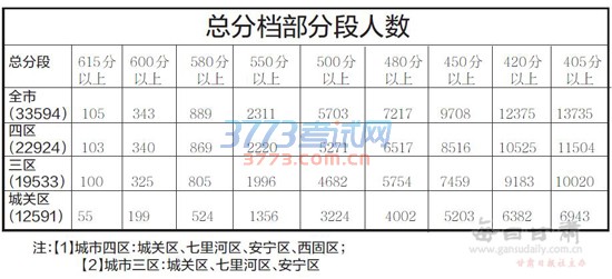 兰州市九年级学生参加的今年中考前的第一次诊断考试已于4月14日结束。截至4月19日,共收到161所学校报送的诊断考试成绩,学生总数33594人。其中城市四区194所学校,学生22924人,城市三区275所学校,学生19533人;城关区46所学校,学生12591人,七里河区19所学校,学生4362人,安宁区10所学校,学生2580人,西固区19所学校,学生3391人,红古区7所学校,学生1462人,榆中县24所学校,学生4149人,永登县23所学校,学生2565人,皋兰县8所学校,学生1356人,新区5所学校,学生1138人。