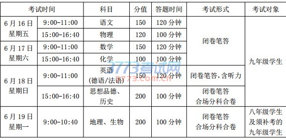 考试时间 科目 分值 答题时间 考试形式 考试对象 6 月 16 日星期五 9:00-11:00 语文 150 120 分钟闭卷笔答九年级学生 15:00-16:40 物理 120 100 分钟 6 月 17 日星期六 9:00-11:00 数学 150 120 分钟 15:00-16:40 化学 100 100 分钟 6 月 18 日星期日 9:00-11:00 英语 (德语/法语) 150 120 分钟 闭卷笔答,含听力 15:00-16:40 思想品德、历史 200 100 分钟 闭卷笔答合场分科合卷 6 月 19 日星期一 9:00-10:40 地理、生物 200 100 分钟 闭卷笔答合场分科合卷八年级学生及须补考的九年级学生