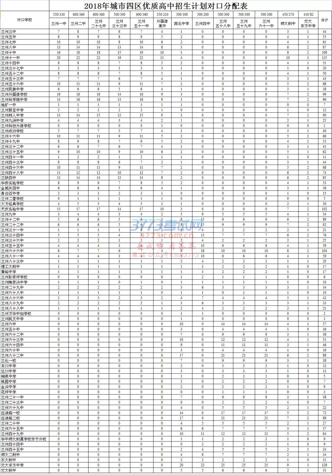 2018年兰州市继续实行优质高中部分招生名额对口分配到初中学校的招生办法,参与分配的优质高中包括12所省级示范性高中(师大附中、兰州一中、兰炼一中、兰化一中、兰炼二中、兰铁一 中、兰大附中、兰州二中、兰州市外国语高级中学、兰州西北中学、兰州二十七中、交大东方中学 )、兰州四中。