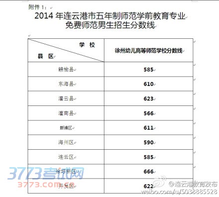 [图文]2014连云港五年制师范学前教育专业免费师范男生分数线
