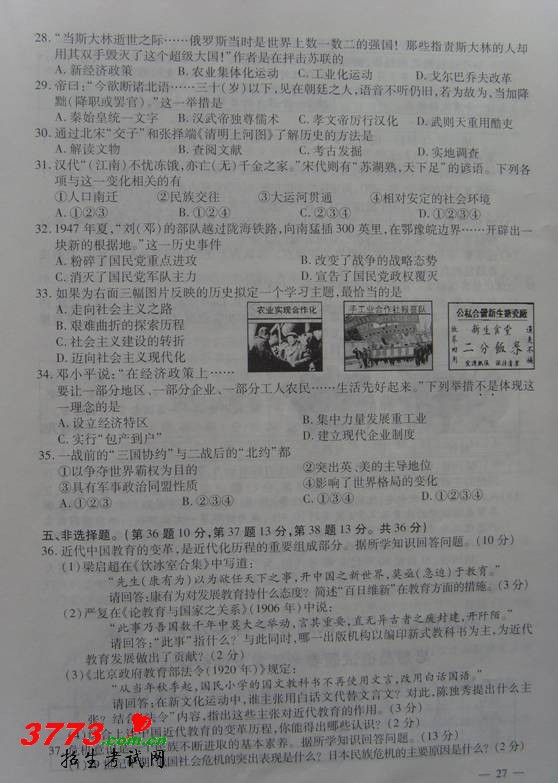 [组图]2012连云港中考政治历史试题答案及评分建议
