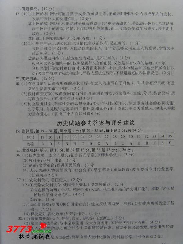 [组图]2012连云港中考政治历史试题答案及评分建议