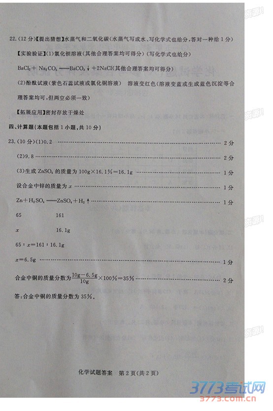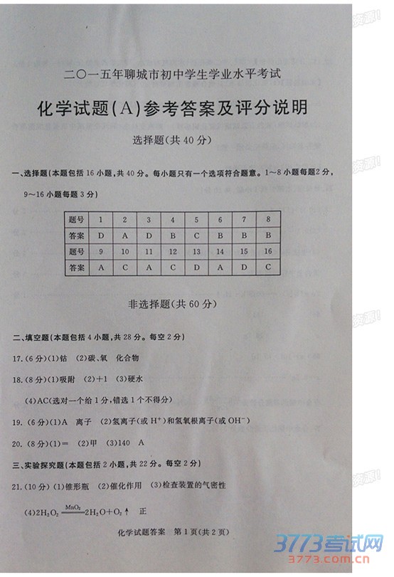 [组图]2015聊城中考化学试题及答案评分标准