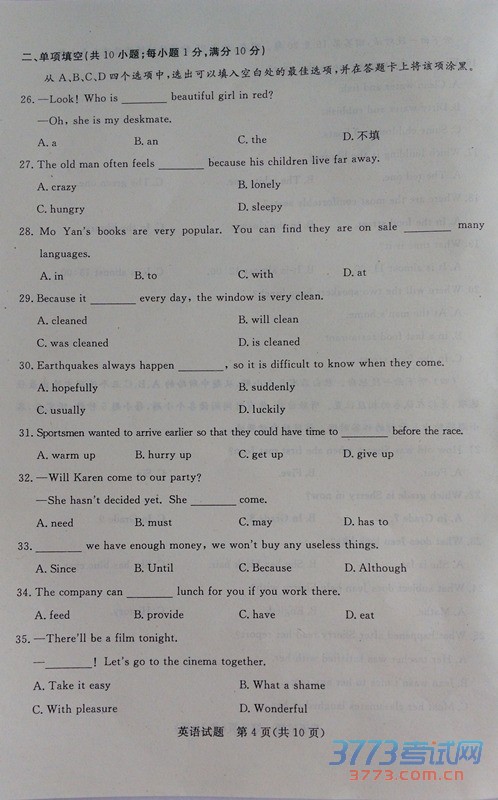 [组图]2015聊城中考英语试题及答案评分标准公布