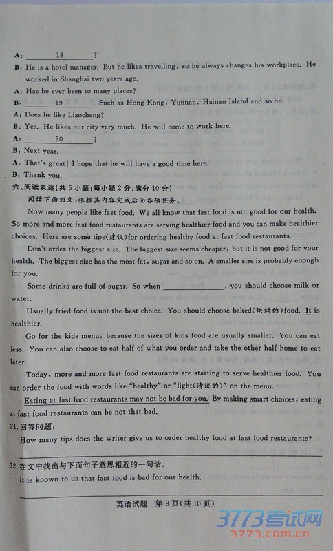 [组图]2015聊城中考英语试题及答案评分标准公布