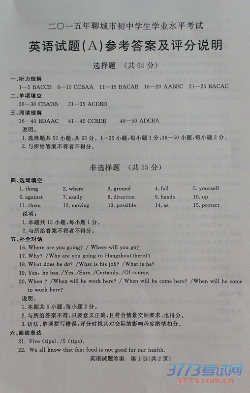 [组图]2015聊城中考英语试题及答案评分标准公布
