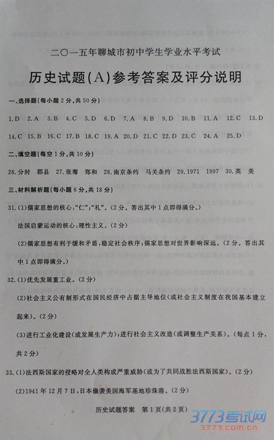 [组图]2015聊城中考历史试题及答案评分标准公布