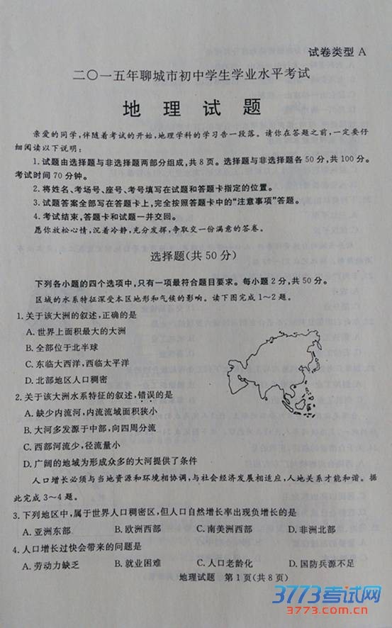 [组图]2015聊城中考地理试题及答案评分标准