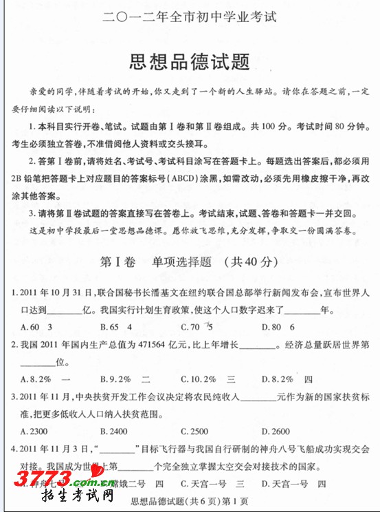 [组图]2012年聊城中考思想品德试题答案及评分说明