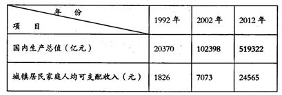 材料二 1992-2012年我国国民经济部分年份简表