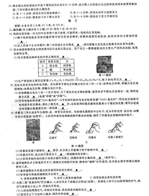 浙江省丽水市2016年中考科学试题(图片版,含答案)