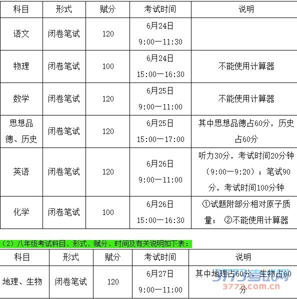 (2)八年级中考科目为:地理、生物。地理、生物学科采取“同堂分卷闭卷”考试模式。
