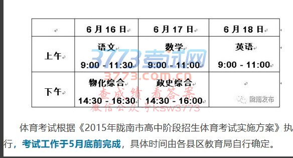 体育考试根据《2015年陇南市高中阶段招生体育考试实施方案》执行,考试工作于5月底前完成,具体时间由各县区教育局自行确定。