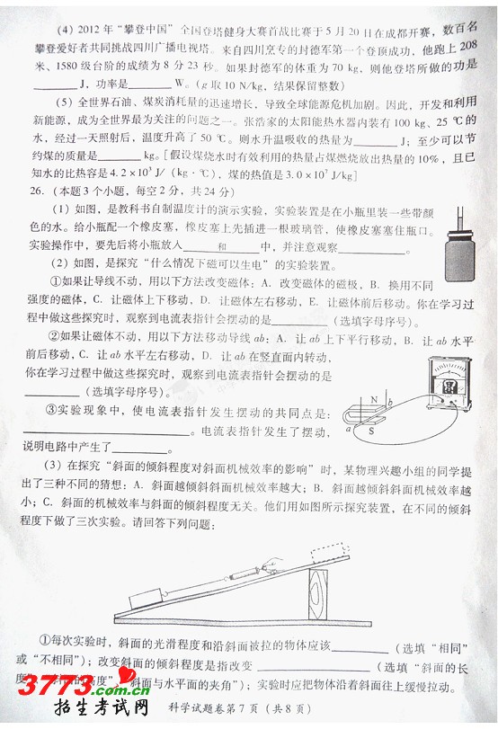 [组图]2012年绵阳中考科学试卷答案及评分标准