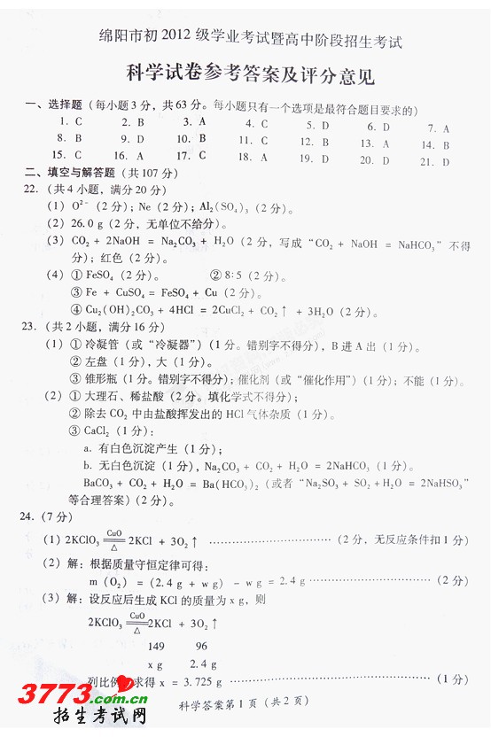 [组图]2012年绵阳中考科学试卷答案及评分标准