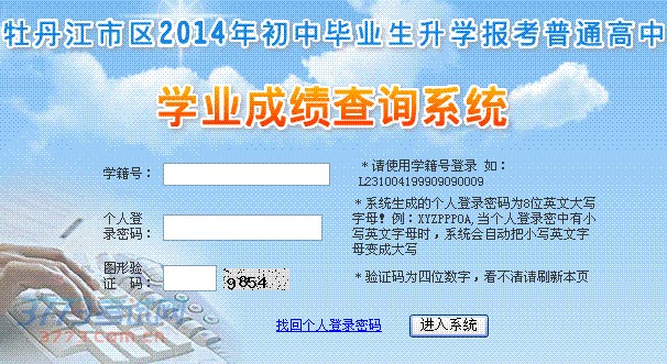 学籍号2014牡丹江中考成绩查询网站快速入口: ﹡请使用学籍号登录 如:L231004199909090009