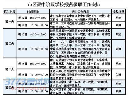 据介绍,市区高中阶段学校统一招生工作在7月12日至15日进行。其中,普通高中招生在7月12日至14日三天时间内进行。在录取时间内,各校的指令性(含定向生和非定向生)和指导性招生计划同时完成。中等职业学校招生工作与普通高中工作同步开始。7月15日完成市一职校、市三职校、市四职校、市六职校的网上报名与预录取工作。