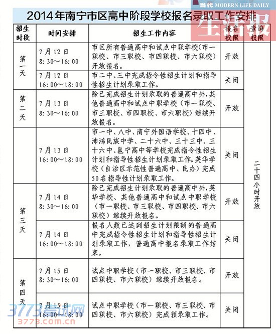 今年首次尝试4所中等职业学校与市区普通高中一起招生。据南宁市教育局发布的信息,今年南宁市区高中阶段学校统一招生工作在7月12日至15日进行,其中普通高中招生在7月12日至14日3天时间内进行,在录取时间内各校的指令性(含定向生和非定向生)和指导性招生计划同时完成。