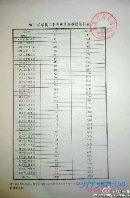 [图文]2015宁波慈溪中考成绩分数段统计表