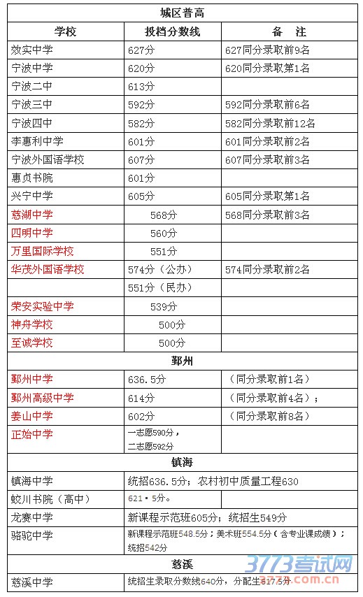 21日晚,宁波市教育局中招办发布信息,城区普高第二批次统招的慈湖中学等七所学校的投档分数线揭晓。至此,宁波城区16所普高统招投档线全部公布。  此外,21日下午,鄞州中学、鄞州高级中学、姜山中学、正始中学等四所普高分数线也已公布。该区其他学校录取分数线将于22日揭晓。具体如下: