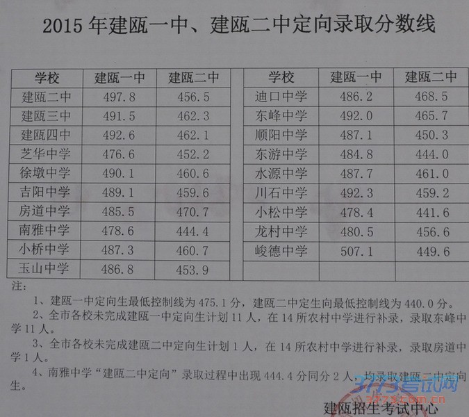 [图文]2015建瓯一中建瓯二中定向生录取分数线