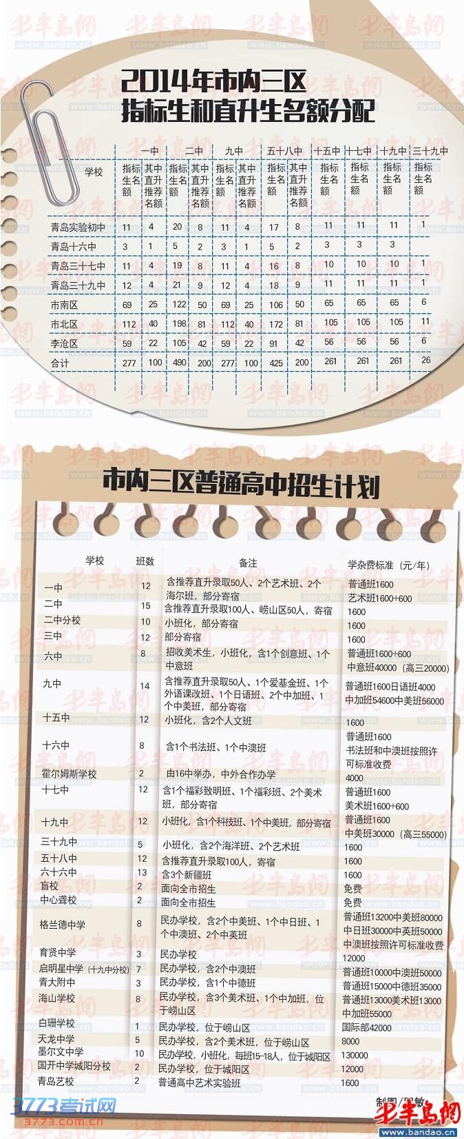 据了解,2014年,青岛指标生的比例将有所扩大,由往年占普通班招生名额的60% 扩大到65% ,而直升生政策方面 ,青岛二中 、青岛五十八中各招收100人,青岛一中、青岛九中各招收50人,总数仍为去年的300人。